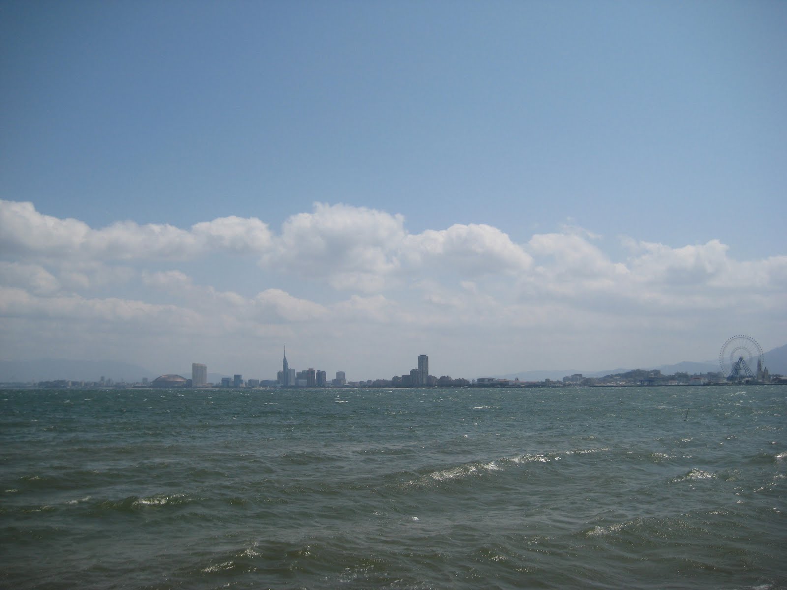 View of Fukuoka City from Nokonoshima. The ferry only takes ten minutes! From left to right: Yahoo! Dome, Sea Hawks Hotel, Fukuoka Tower... and then way to the right is one of the biggest ferris wheels in all of Asia that is being disassembled and shipped to Taiwan :(
